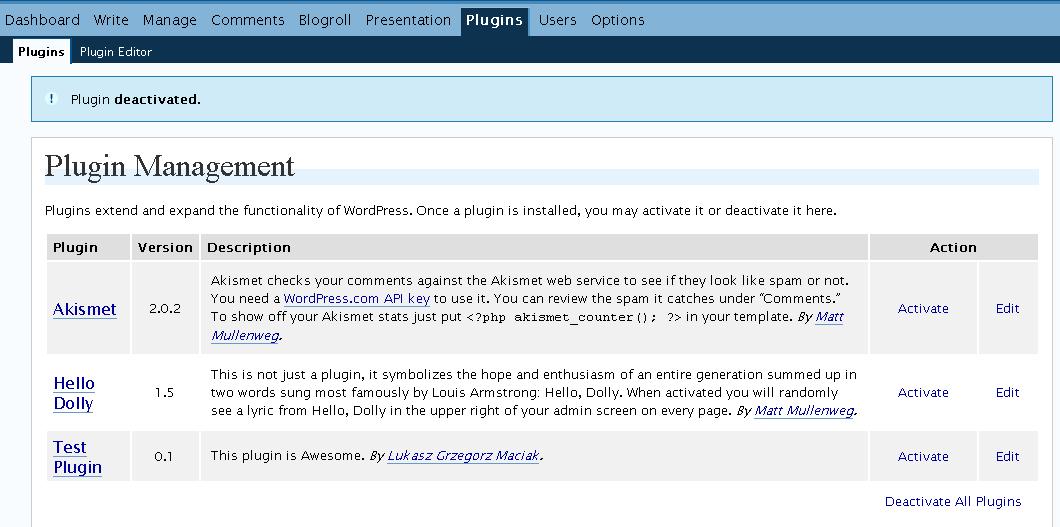 Now all we have to do is to activate the plugin. If it works, it should tell you that activation was successful, and the entry should become green. If you have some errors in your script, you will get a brief error message. Usually it’s something among the lines of “unable to activate the plugin due to fatal error”. This makes debugging your plugins bit difficult, so it’s a good idea to use an editor which checks PHP syntax as you type, like for example Komodo Edit. This will cut down on the number of silly typos, and forgotten semicolons in your code.
