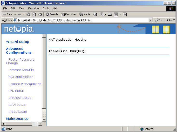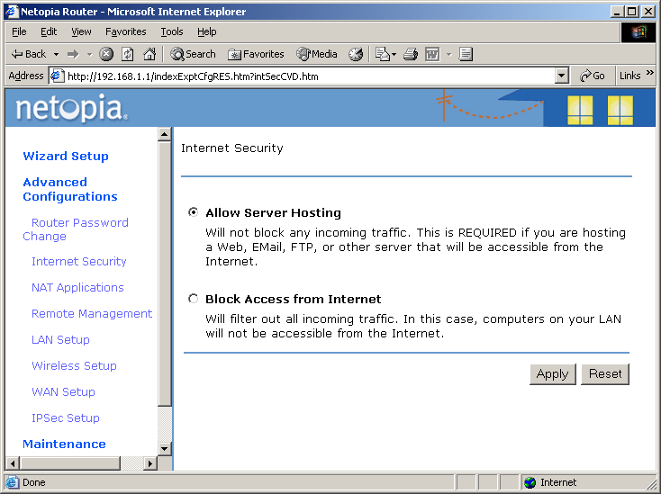 First navigate to Advanced Configurations and choose Internet Security. We don’t want Netopia doing any kind of Firewall like stuff. This is what the Sonicwall is for and it does it much better. So check Allow Sever Hosting on this screen.