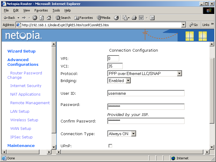 First you will need to configure the Netopia router. So connect it to any computer, and pull up the web interface at 192.168.1.1. By default both the username and password are admin. Don’t forget to change that!