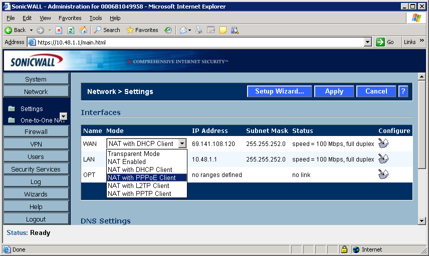 Get into your Sonicwall control panel, and open the Network section. There, choose NAT with PPPoE Client from the pull-down menu: