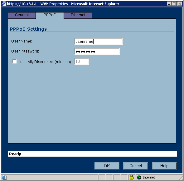 You should see an automatic popup window. If you are with Covad like me, you can safely ignore the General tab. It will be overwritten anyway. Switch to the PPPoE tab and enter your username and password.
