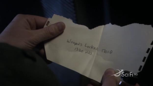 This is the super-secret note that Colonel Tigh (a very senior military officer, and the former leader of the New Caprica resistance movement) passed to Chief Tyrol (who also had experience in NC resistance movement) about an incredibly secretive meeting which was accidentally intercepted by Tyrol’s wife Cally. This sort of thing happened to me too – back in grade school. Since then, I have learned to use encryption.