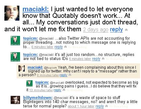 As you can see, it’s almost there. It just that a lot of the tweets simply got dropped for various reasons. For example, using the @name notation in your message more than once will confuse the system and it won’t link to anything. The other issue was that at one point Miloš and Billy were talking to each other and while I still saw their conversation happening on my updates page , and it was still regarding the same topic page, Quotably wouldn’t associate it with my name and include them in this thread.