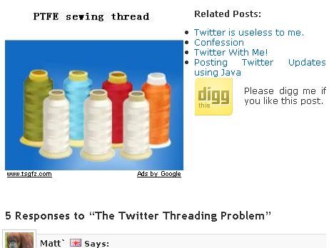 This sounds harsh, and I mean it with a light heart. I guess my main point is: I don’t think twitter was designed to have threaded conversations just like wordpress isn’t designed to give the commenter of your blog (inherently) a part of your pagerank, or give them much coverage at all because its supposed to be about the blogger.