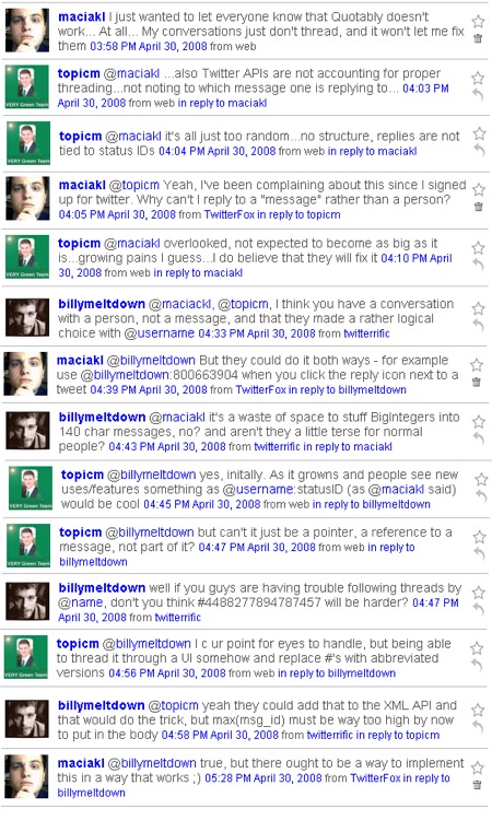 Quotably is a valiant attempt to automatically generate stuff like the manually constructed conversation above. Unfortunately due to the fact that Twitter’s threading model is broken by design it doesn’t always work. For example, here is what it caught from this conversation:
