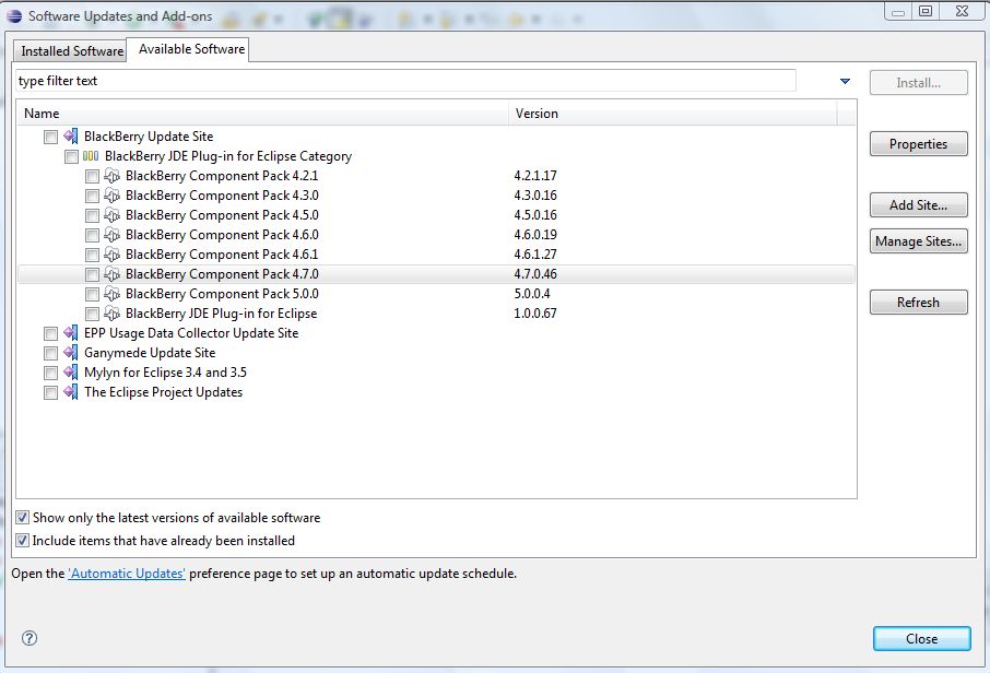 So, what does it take to be a Blackberry developer? First you must obtain an outdated version of Eclipse. Yeah, the obsolete one. If you get Galileo the Blackberry JDE plugin will totally hose your installation. Yeah, it will positively demolish, cause it to bug out at start-up and won’t allow you to type anything. There is no un-install feature either, so just don’t install it in your “good” Eclipse folder.