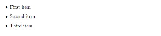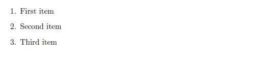 As you can see it is a standard environment just like the ones I have shown you before. The only difference is that you preface each item on the list with an \item command. Here is a sample output: