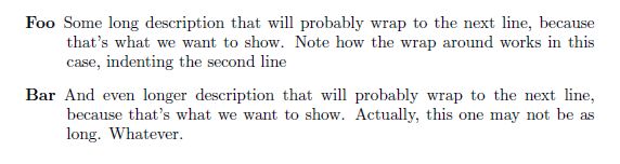 \item[Bar] And even longer description that will probably wrap to the next line, because that's what we want to show. Actually, this one may not be as long. Whatever.