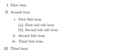 As you can see, the last argument can be formatted any way you like. You can add dots, parentheses, dashes and etc.. These settings will affect the rest of the document from the point where you first specify them, so if you want to mix and match styles you will need to do this several times in your document. Here is a sample output: