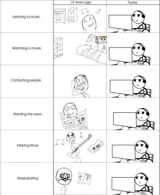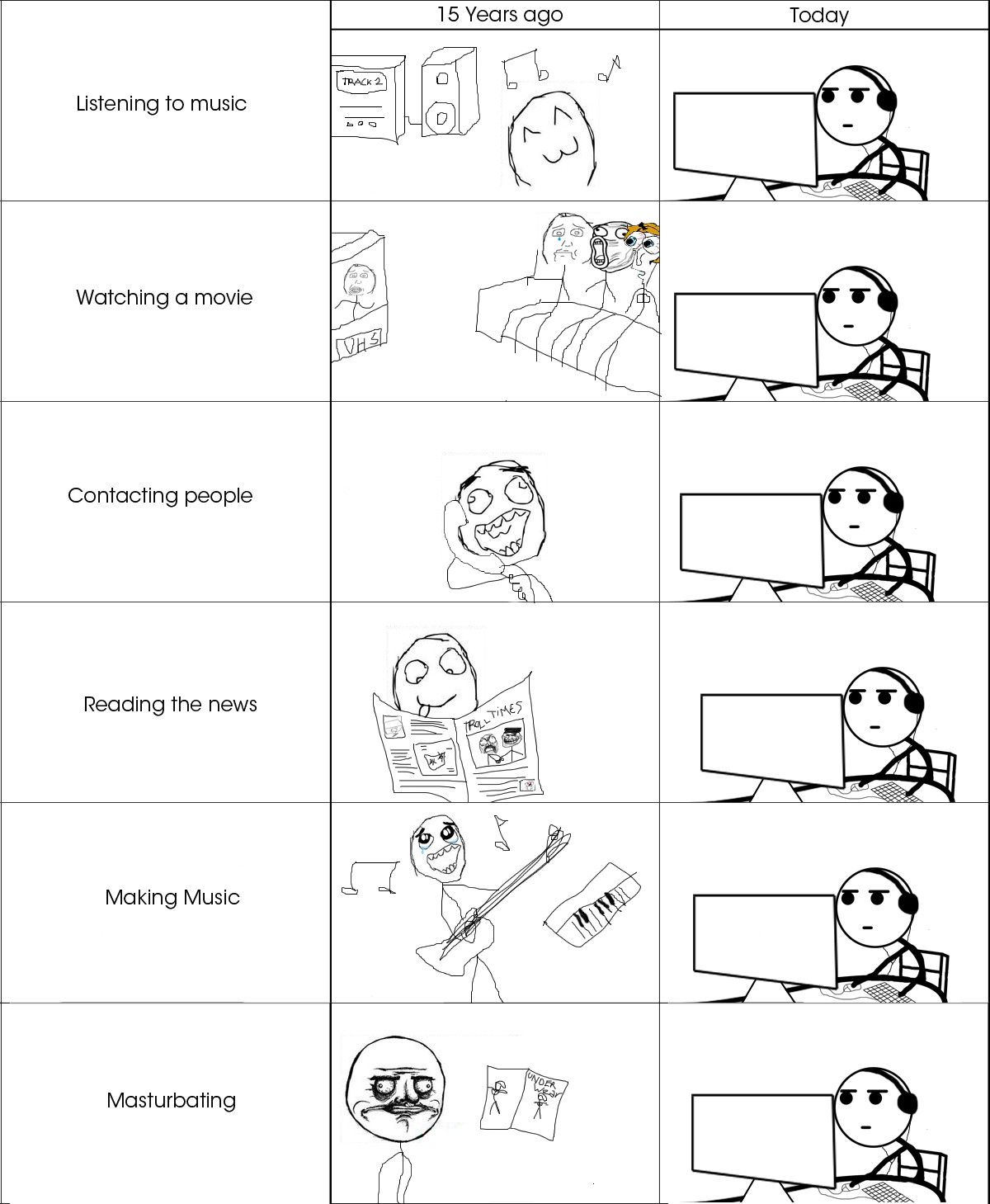 You have doubtlessly already seen this drawn meme-comic already, but I will repost it for the sake of the argument. While crudely drawn (or rather crudely assembled from copy and pasted bits) it gives us an interesting commentary on the way technology has changed our lives in the last decade or so.