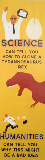 What I would really like to know is the reason why the creator of this image thought that the job of a humanities major is to teach scientists about ethics. Last time I checked, morality fables were kinda low brow. A story titled “A scientist made a dinosaur, and then got eaten because hubris is bad” ain’t exactly something to aspire to, isn’t it? It’s very much an old and tired cliché. I’d hope you would encourage students to write something more ambitious than that. To say something new and interesting about the human condition.
