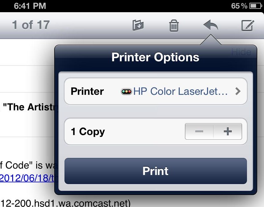Like fucking magic (which by the way is different from regular magic) it just shows up in your print menu. There is no setup, no drivers, no futzing around with IP addresses – you just hit print, and it does. The printers advertise their presence on the network, and the iOS devices know how to find them. It is amazing. This is the sort of thing that makes Apple users such snobby jerks – if you do things the Apple way things just fall into place and there is little to no friction at the interface between human and his technology.