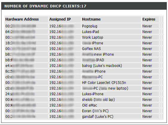 You will probably notice that my DHCP leases are set to never expire – that’s actually on purpose. I permanently assign IP addresses to machines on my network. This makes network issues easier to troubleshoot, and actually lets me make sense network logs. But since I use a lot of roaming mobile devices and share the network with people who couldn’t be bothered to set up static IP on their machines I use DHCP reservations to accomplish that. But that’s a digression.