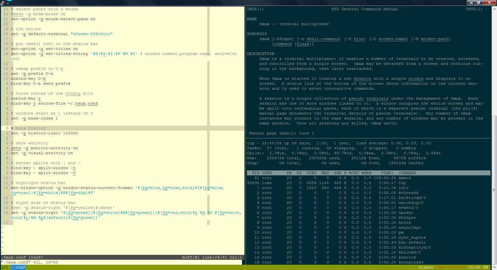Here you see me editing .tmux.conf viewing the man page, and keeping my eye on how hard PogoPlug is working by running top. All on one screen via single PuTTY SSH session from windows. And if I accidentally close my PuTTY window, all I need to do is to ssh back into the box, and issue a single command: