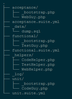 At the moment I’m mostly concerned with acceptance testing. Codeception has a unit testing module, which is built around PHPUnit. Their idea is to make writing tests simpler. I could adopt it, but it means I would have to re-write my tests in the Codeception syntax which is essentially just an abstraction layer. At this point it is a waste of time, so I can simply get rid of the unit, and functional modules and re-organize my test directory to look like this: