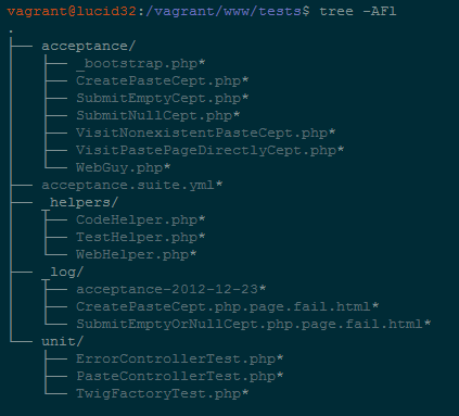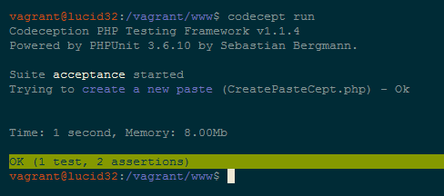 It will create a new file tests/acceptance/CreatePasteCept.php with some basic sample code. We can expand it to a full test like this: