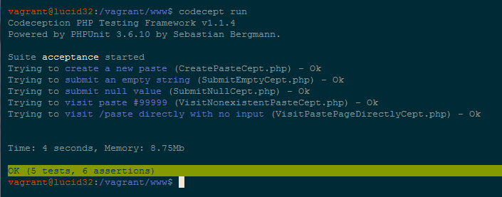 The testing layer is actually driven by PHPUnit so running the tests using the command codecept run will bring up a very familiar interface: