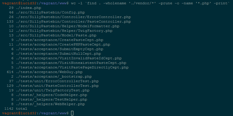 Note that the WebGuy.php class was auto-generated by Codeception, so those 614 lines can be subtracted from the total, since we did not write them.