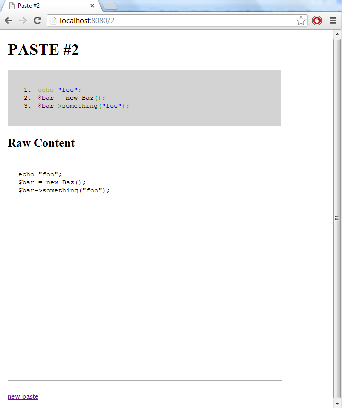 Our Twig template will receive both the highlighted and non-highlighted copies of the paste. Why? Because we can display the non-highlighted code in a text box for easy copying, and the highlighted, enumerated code above it for easy reading.