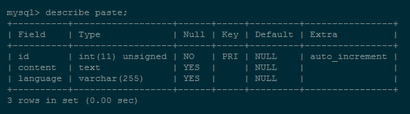 This is actually not terrible. Choosing VARCHAR(255) for language seems excessive (although I don't thing varchar actually reserves the max space so we're probably not wasting anything), and INT(11) UNSIGNED for the primary key might be a tad small if we were planning to build a live site. Still, those are pretty good guesses. And it all happens auto-magically and behind the scenes.