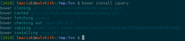 This command will find the jQuery package in the Bower package repository, download it and put it inside components/ folder. This is more or less how it looks like: