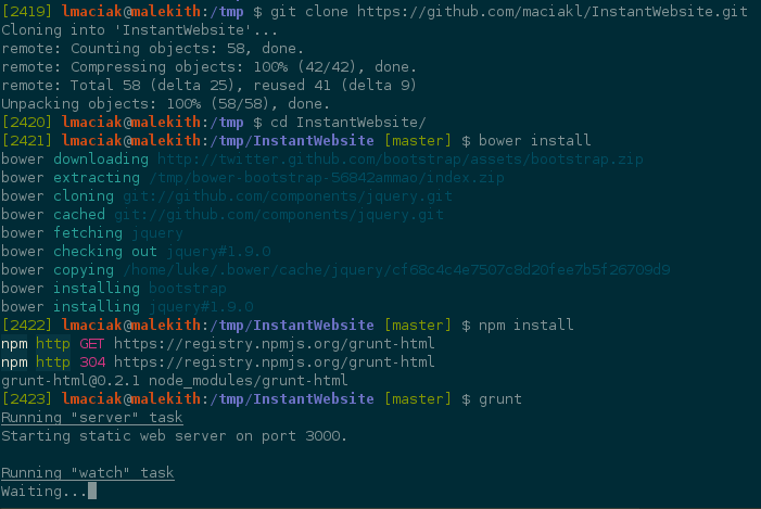 This essentially gives you three tasks: validate HTML with grunt-html plugin, watch files and validate them as they are changed and run local server. Note that I don’t have any JS linting or minification in place because those things are a bit out of scope for this project. This is designed to scaffold very, very simple web pages – not web apps. For web apps, definitely use yeoman.