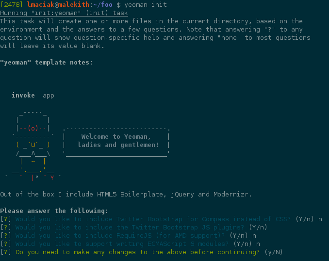 All I can say is: download it and try it. It is very, very neat tool. Let me just give you a little peak at how it operates. This is what you are going to see if you run the yeoman init command: