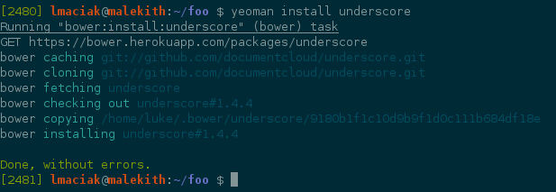 As you can see from the screenshots, HTML5 Boilerplate, Twitter Bootstrap, jQuery and Modernizr.js are included in a standard package. If you need something extra, you can add it using the yeoman install command which runs bower on autopilot for you: