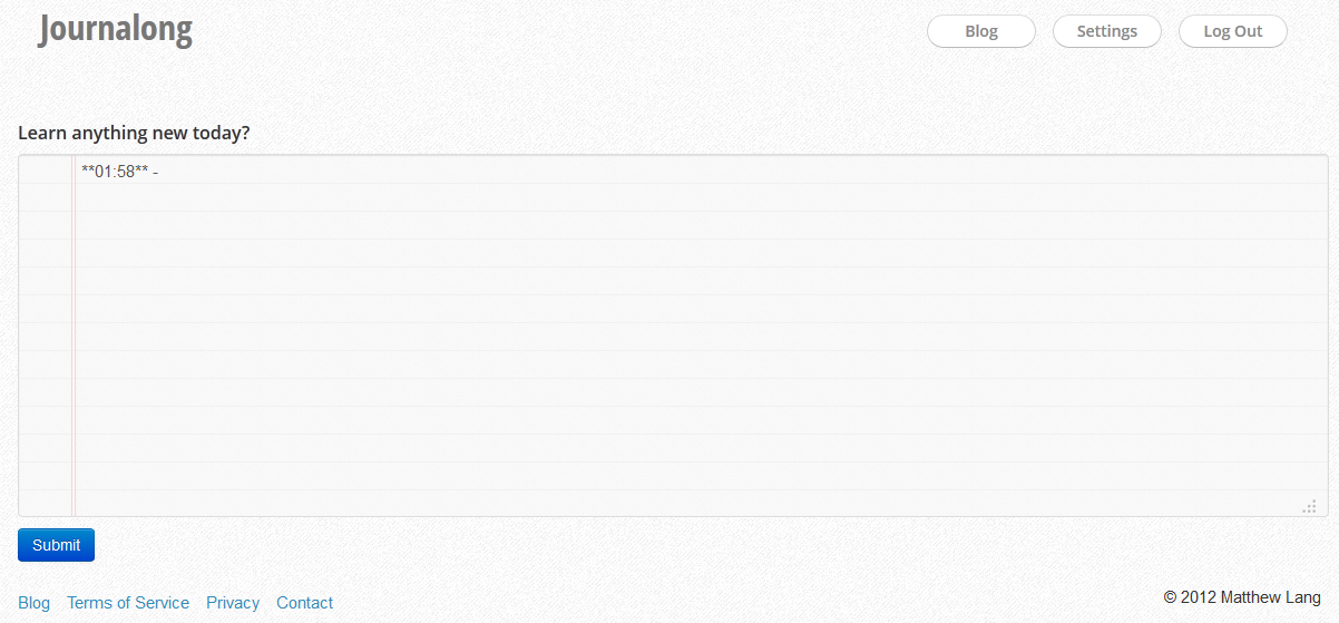 No, seriously. I’ve been using Journalong’s free trial and I actually kinda like the functionality it provides. But it is super simple, and the more I used it the more I realized I could actually do better. So I sat down and implemented my own Dropbox Journal in approximately 150 lines of Ruby (not counting HTML markup). I called it Markdown Journal.