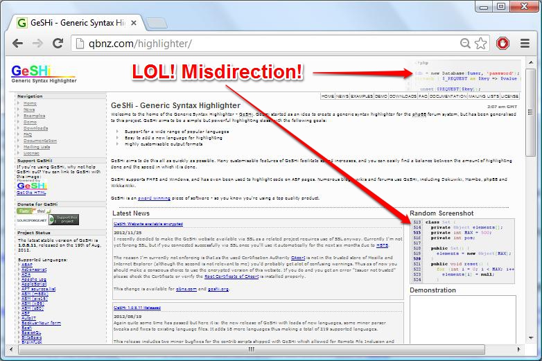 Note the clever use of misdirection: someone new to the site might try to click the two “code snippet” looking areas on the site thinking they lead to examples. Nope, those are screenshots of code that was highlighted by GeSHi! The actual instructions of how to produce such results however are buried deep in the documentation.