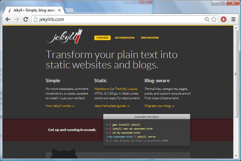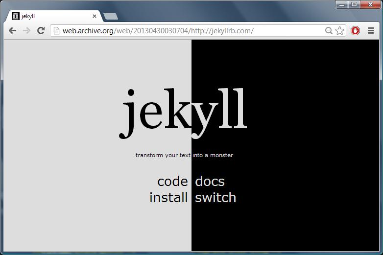 The moody, mysterious text about monsters is gone, replaced by actual description of what the software actually does. The spartan, black and white design was dropped in favor of a responsive grid driven piece of crap. Worst of all, now there is a box on the bottom of the page that shows you how to install the tool and set up a new website. Back in the day actually figuring out how to boot-strap Jekyll website was a right of passage that ensured only the most determined programmers used the platform. Now it seems accessible to just about anyone.