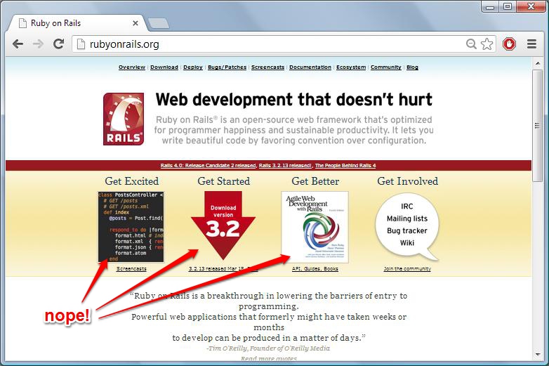 Let me use an example here: Rails is undeniably one of the most popular web design frameworks out there. It is well funded and it has a huge community. This is not necessarily due to the design of their website, but I’m sure that it helps them to maintain that lead. Just look at this masterful layout: