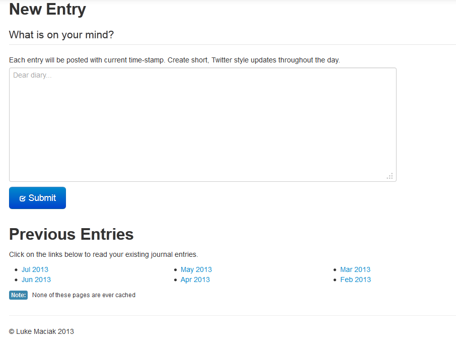 The only issue it didn’t really address was reading the damn thing. It turns out that sometimes you just want to go back and read what you wrote, and I didn’t actually put that functionality into my app because I didn’t really want to host or cache anyone’s personal writings on my server. I always imagined my app being just a web-editor front end for the files you store in your private Dropbox account. I figured that if you wanted to read your journal you’d just go to the source files and read them. Of course based this assumption on a survey I conducted on users of the application with the sample size of: me.