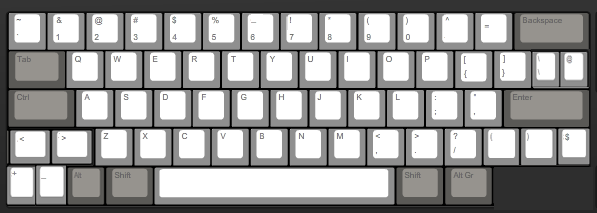 The standard ANSI and ISO layouts are not optimal designs. They don’t work all that well for writing prose, but they are especially horrible for programmers. The useless keys are up in your face, whereas common programming symbols are inaccessible without modifiers. David’s post got me thinking about how one would go about designing something more suited for day to day coding.