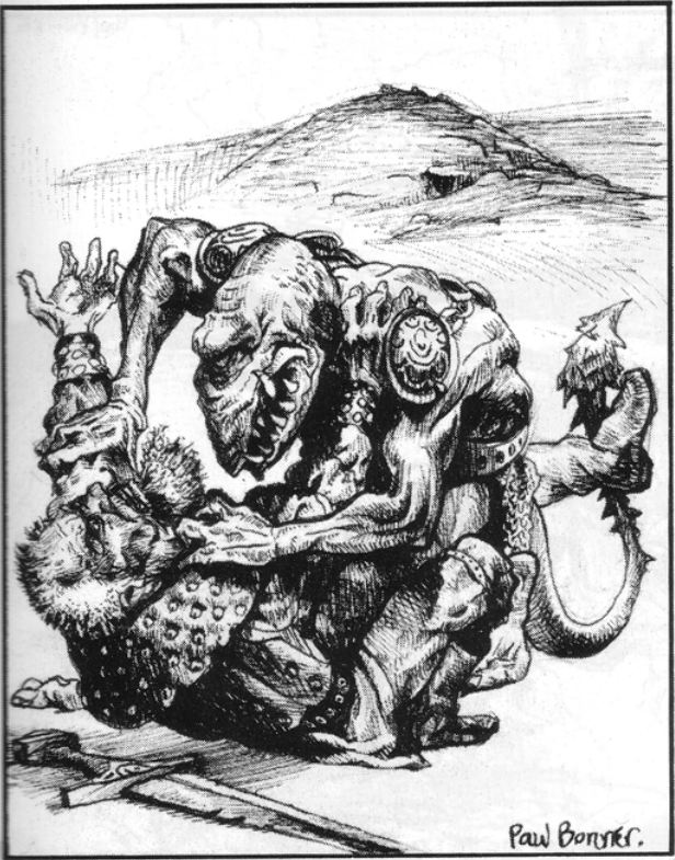 Graeme Davis had been tasked with creating a new race. So between us we came up with the Fimir He working on the text and me on the visuals. The starting point was a book cover that Graene found featuring a Fomorian as depicted by Alan Lee. I mutated the image and Graeme shortened the name and changed the vowels. Not the most original thing either of us did.