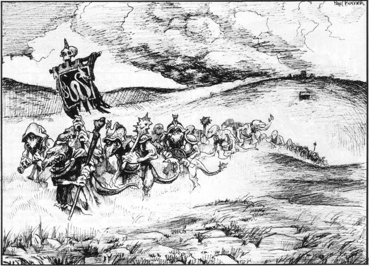 His ambition was to build Warhammer up into a recognizable, and marketable brand name rather than just one of many fantasy settings that existed on peripheries of D&D. He wanted to capitalize on Warhammer’s distinctive feel, and make it memorable and instantly recognizable. To properly market that uniqueness he needed an original monster that could be put on book covers and merchandise. Something akin to the Beholder: a creature that is unmistakable D&D trademark. And so, he came up with Zoats: a centaur like space lizards heavily inspired by of Poul Anderson’s Polesotechnic League stories. They looked like this: