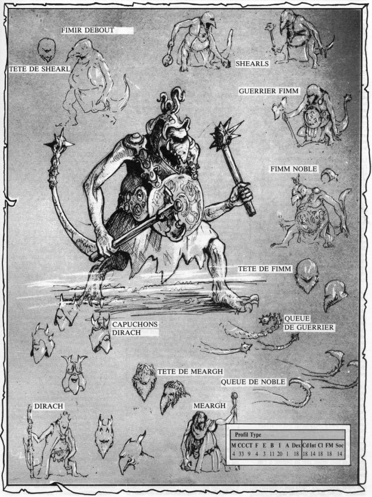 It all started when Bryan Ansell decided that WFRP should introduce a new race to the WH world – “to be as distinctive of Warhammer as the Broo are of Runequest” were his exact words if memory serves – and to this end he came up with the Zoats, which everyone hated, but which he said would have to go in if no-one could come up with anything better. And he *did* own the company, so we took the threat seriously. So as I say, Jes and I came up with the concept for Fimir, Jes did the designs and I did the culture and game stats – and in the end, both Zoats and Fimir ended up in WFRP, and nobody much cares for either race.