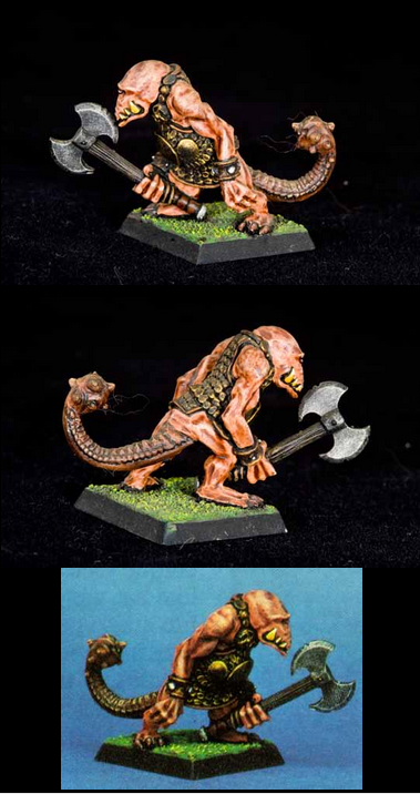 I agree, I loved them ever since I first came across them in HeroQuest. In fact to hear there seems to be annoyingly two different ideas on what size they should be-and what size is correct exactly?-is irritating to say the least. I always felt they otherwise brilliantly sculpted models in HeroQuest were an inch too small at least. I briefly saw a few of the lead ones around, though never got any, pity. Prices were terribly steep, and maybe a few were oversized, but then I always thought of them as more nearer the Troll/Ogre/Bugbear size of the scale than the human/Elf/Orc/Chaos Warrior size they are. But the HeroQuest ones are the easiest to get hold of via eBay on a budget, so I just ignore their small size and pretend they’re the foot taller than a human I imagine a full adult to be whenever I use them, which is often as I love them. As for their dodgy mythology, I don’t see why they can’t be race in themselves, nor why they can’t reproduce themselves, nor why should they be any more savage in life than your average Barbarian-or even just town living “civilised” human being! Why does everything have to be a “human” once before they get “changed” into a monster, as if humans have to make up 90% of humanoid life on whatever world we’re basing our fanatsy worlds in. Only an human creator could be so arrogant…?