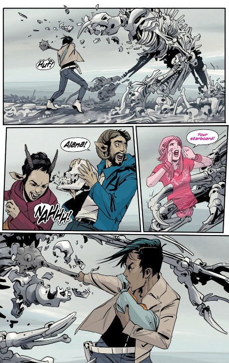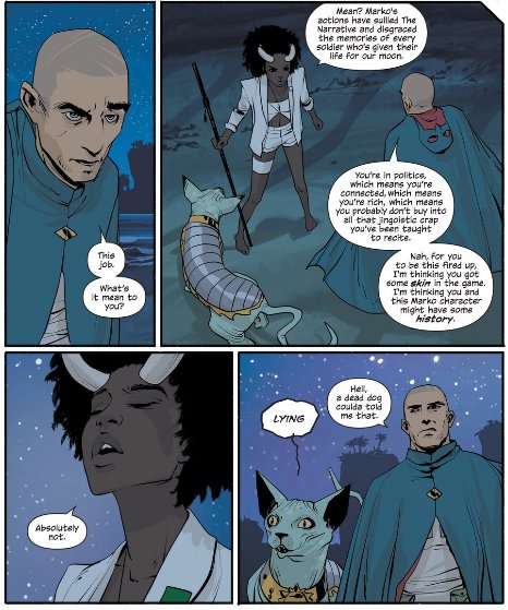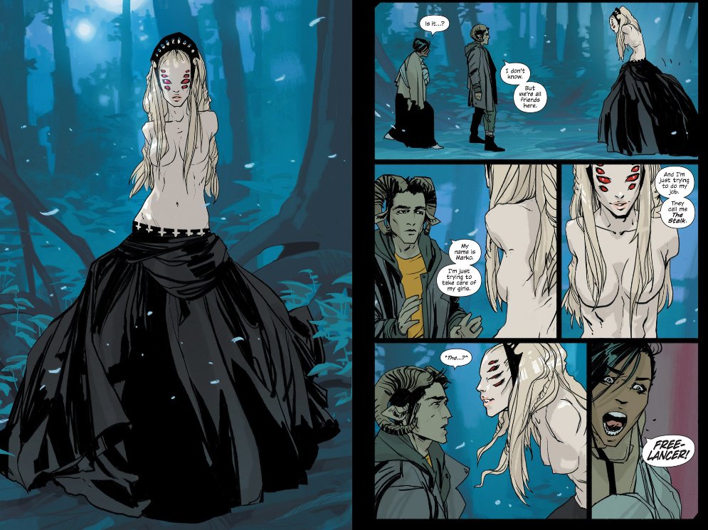 One of my favorite parts of the series is the effortless, organic way in which it treats diversity. It is a big topic because of the fact that a lot of our media severely lacks it. Saga doesn’t really have any human characters (except maybe The Will, though it is never established if he is actually human or some human-proxy species) most characters are very human like. Marko’s race, for example are basically people with horns, and Alana’s are people with wings. But instead of making all of them look like white folks (or white folks palette switched to blue or green as it is often the custom) the authors instead create a vastly diverse cast. For example, Marko and his family have distinctly Asian features whereas Alana seems vaguely Hispanic. Marko’s ex-fiance who becomes a prominent (btw, Gwendolyn & The Will OTP) antagonist is unmistakably black.