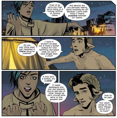 None of this seems forced. Despite being a story of inter-species love Saga never really tries to be preachy or even appropriate. It is definitely R-rated, raunchy, violent, and irreverent comic. It does not pull it’s punches and it does not shy away from showing vice, brutality or prejudice. It’s characters are flawed, and they love, hate, make mistakes and sometimes do terrible things either by accident or out of spite. And that’s what makes it so great.