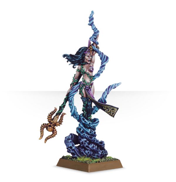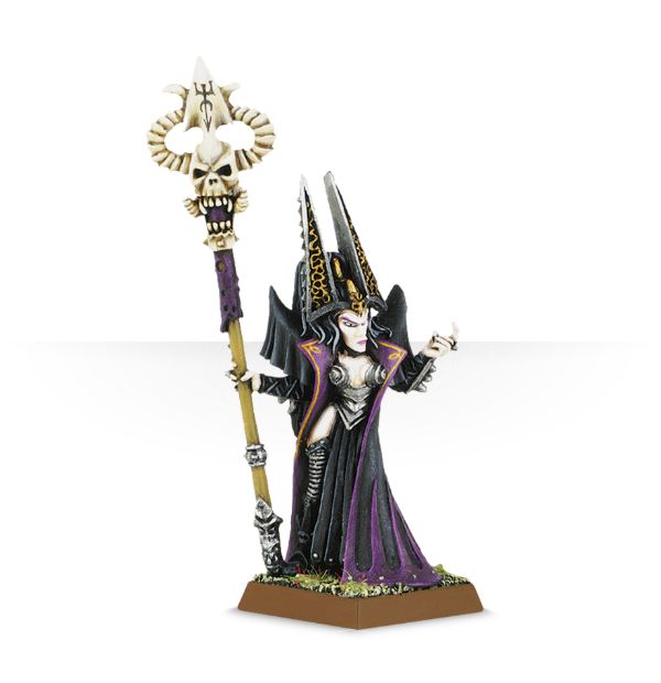 Perhaps I was looking in all the wrong places. Dark Elf army book actually includes rules for Morathi, the most powerful and influential dark sorceress of them all. She is actually one of the oldest living beings in the Warhammer universe, and some say she is actually the true ruler of Nagaroth (and that her son, Malekith the Sauronesque Witch King is merely a figurehead). Out of all the miniatures in the Dark Elf range, hers should have the right mix of power, gravitas and grace…
