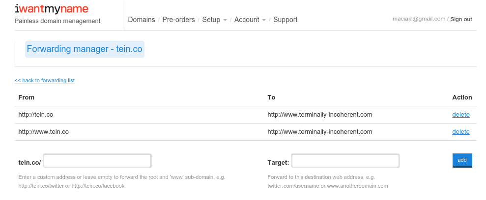 To compress my addresses even further I purchased a brand domain: tein.co Unfortunately ti.co and in.co were already taken so this is the next best thing I could think of. It’s not pronounceable, but it is short, and visually similar to my long domain.